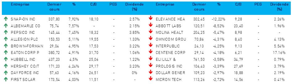 - Elevance Health {{10878933, ELEVANCE HEALTH INC., ELV}} : l’action de cet assureur santé a chuté après l’annonce d’un bénéfice trimestriel de 8,84 dollars par action, alors que les analystes tablaient sur 8,95 dollars par action. À 49,42 milliards de dollars, pourtant, le chiffre d'affaires est supérieur aux attentes (48,23 milliards de dollars).