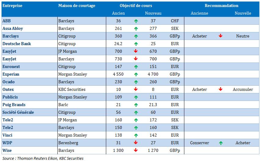 - Aedifica {{15954457, AEDIFICA SA, AED}} : le groupe immobilier belge fait état d’une possibilité de retards dans la finalisation de sa fusion avec Cofinimmo, en raison de questions supplémentaires posées par l'autorité belge de la concurrence. Les autorités allemandes et néerlandaises ont déjà donné leur accord, mais en Belgique, la procédure d'examen pourrait prendre plus de temps que prévu, ce qui ne restera pas sans impact sur le calendrier initial de la transaction. Pas d'impact cependant sur la recommandation « Conserver » ni sur l'objectif de cours de 70 euros.
