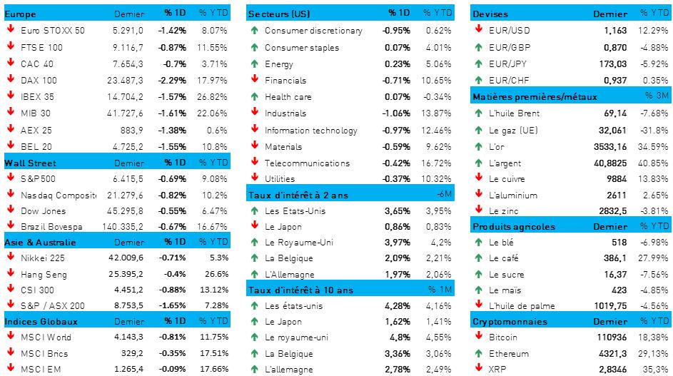 - En particulier, les taux à très long terme continuent de subir des pressions à la hausse. Au Japon, le taux à 30 ans a atteint un nouveau niveau record cette nuit ; de même, les investisseurs continuent d'exiger une rémunération de plus en plus élevée pour les titres européens à long terme. En France, le taux à 10 ans a augmenté jusqu’à 3,59 %, portant l'écart de taux avec l'Allemagne à 84 points de base. Cela n’a pas empêché le dollar US de s’apprécier par rapport à l'euro (1 € = 1,1639 $).