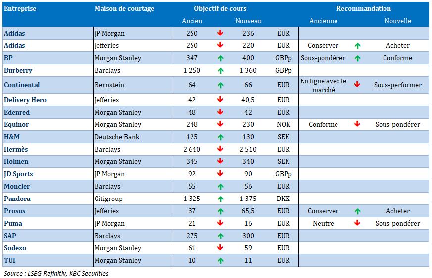 - QRF {{93922159, QRF COMM. VA, QRF}} : le fonds immobilier belge a publié vendredi des résultats inférieurs aux attentes, principalement en raison de la faillite de Casa, qui représentait 6,9 % de ses revenus locatifs en 2024. La vacance et la relocation de cinq immeubles pèseront encore sur les résultats de l'exercice 2026. Quant au bénéfice EPRA par action, il ne devrait pas retrouver son niveau de 2024 avant l'exercice 2027. Pour l'exercice 2025 les estimations ont été revues à la baisse, de 8,0 % à 0,83 euro par action, au lieu de la moyenne des prévisions des analystes de 0,90 euro. QRF confirme sa prévision de dividende de 0,84 euro, ce qui correspond à un taux de distribution supérieur à 100 %. KBCS abaisse sa recommandation, de « Acheter » à « Conserver », et son objectif de cours, de 13 euros à 11 euros.