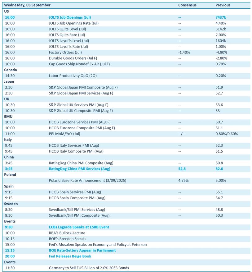 - On a cependant appris une bonne nouvelle pour l'économie chinoise : l'indice PMI du secteur des services est passé de 52,6 points à 53 points en août, au lieu du recul à 52,6 qui était attendu. La nouvelle est d’autant meilleure que cette expansion est la plus forte que l’on ait pu observer depuis mai 2024, soutenue par de nouvelles commandes et par une accélération de l’augmentation des exportations. Notons un point négatif, toutefois : des pertes d’emplois dans le secteur des services, dans un environnement marqué par des hausses de prix modérées dues aux salaires et aux prix des matières premières. Le sentiment continue cependant de s'améliorer, ce qui est particulièrement encourageant.