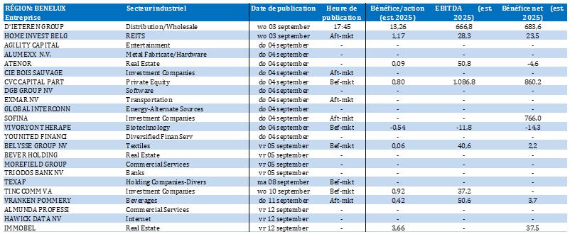 - Care Property Invest {{100086387, CARE PROPERTY INVEST, CPINV}} : le bénéfice EPRA ajusté de cet investisseur immobilier belge, spécialisé dans le secteur des soins de santé, augmente de 13,0 % au premier semestre, à 22,5 millions d'euros, soit 0,61 euro par action. Les revenus locatifs ont augmenté à 36,6 millions d'euros et le portefeuille immobilier est valorisé à 1,25 milliard d'euros, avec un taux d'occupation de 100 %. Pour l'exercice 2025, la société relève ses prévisions de bénéfice à au moins 1,11 euro par action, au lieu de l’estimation précédente de 1,08 euro. Le dividende brut devrait rester stable à 1,00 euro par action. Aucun impact sur la recommandation « Conserver » ni sur l'objectif de cours de 14 euros.