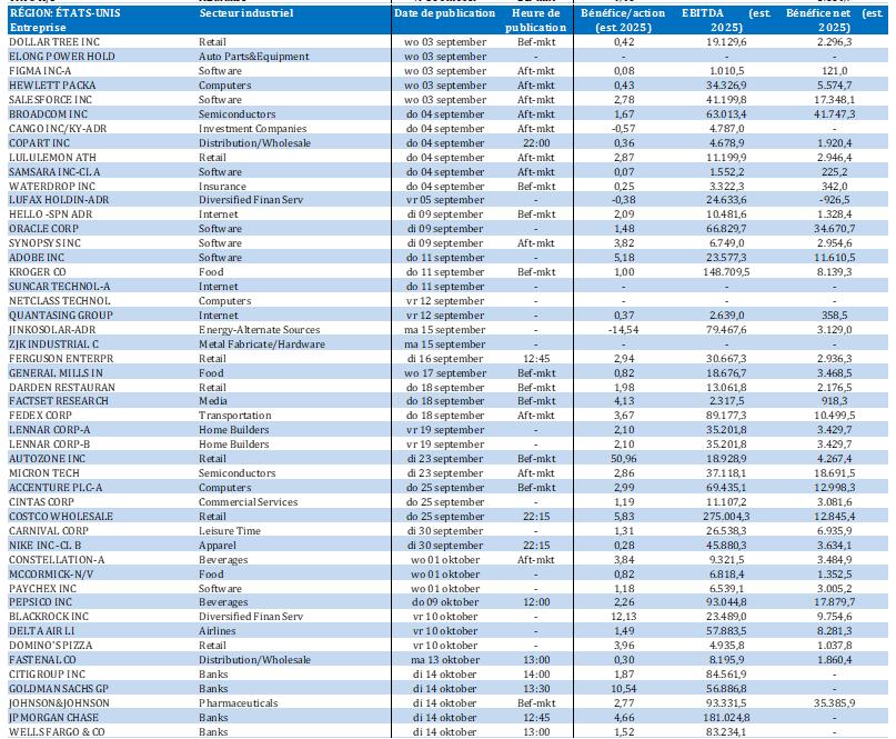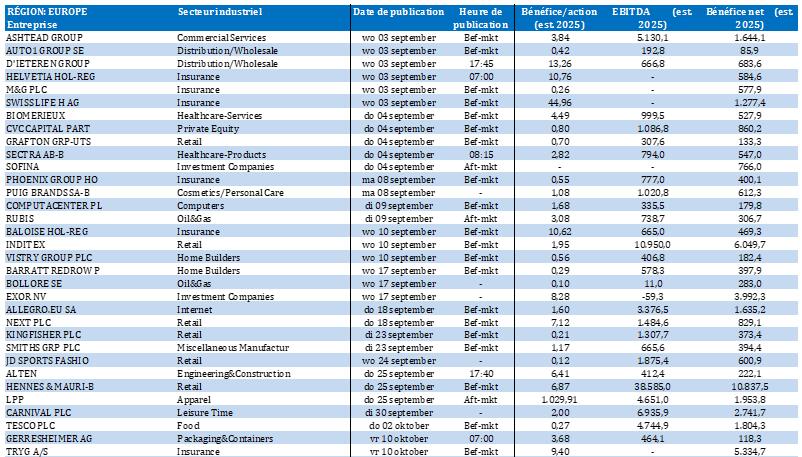 - États-Unis : rapport JOLTS sur l'emploi (juillet), commandes de biens durables (juillet), publication du Beige Book