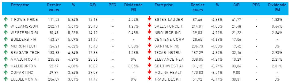 - American Eagle Outfitters {{13595954, AMERICAN EAGLE OUTFITTERS INC., AEO}} : forte hausse du titre de ce détaillant de prêt à porter après l’annonce pour le deuxième trimestre d’un bénéfice par action de 0,45 dollar pour un chiffre d'affaires de 1,28 milliard de dollars. Les analystes s'attendaient à un bénéfice de 0,21 dollar par action et à un chiffre d'affaires de 1,24 milliard de dollars. Cet excellent résultat s’explique en partie par une campagne publicitaire mettant en scène l'actrice Sydney Sweeney, campagne que American Eagle a décrite comme l'une de ses « meilleures » à ce jour.