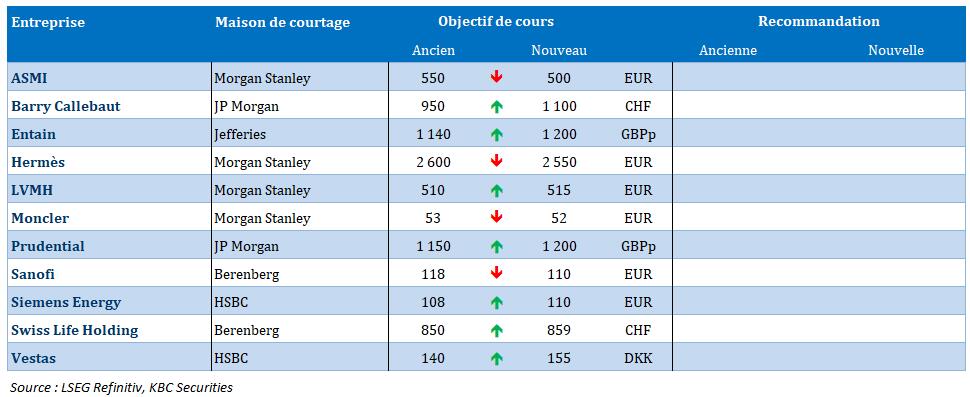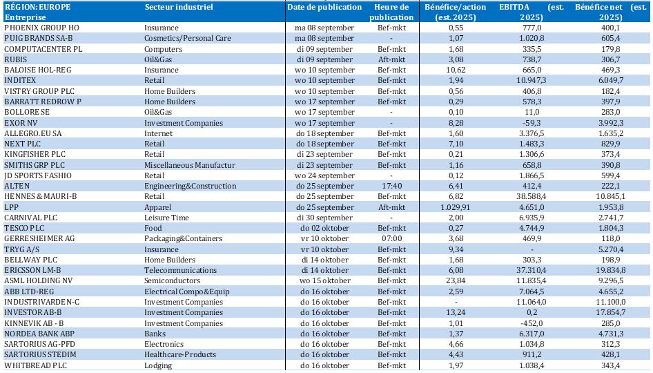 - Sofina {{29315, SOFINA SA, SOF}} : cette autre holding belge annonce au premier semestre une baisse de 4,8 % de sa valeur intrinsèque, à 9,8 milliards d'euros, principalement en raison de la dépréciation du dollar US, dans lequel environ 61 % du portefeuille est libellé. Malgré ces effets de change, les investissements directs enregistrent de solides performances opérationnelles, créant de la valeur dans les fonds privés libellés en monnaie locale. Plusieurs nouveaux investissements, notamment dans Proeduca et Scalable Capital, ainsi que des désinvestissements ciblés, tels que First Eagle, bioMérieux et Bytedance, soulignent la gestion active du portefeuille. Sofina continue de privilégier des secteurs en croissance tels que l'éducation, la santé et la transformation numérique, et maintient sa stratégie de capital patient pour une croissance durable. KBC maintient sa recommandation « Acheter » et son objectif de cours de 315 euros.