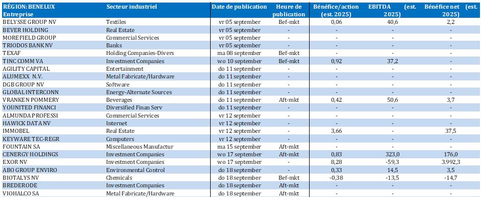 - Bois Sauvage {{29247, COMPAGNIE DU BOIS SAUVAGE SA, COMB}} : la holding belge affiche au premier semestre un bénéfice net de 5,4 millions d'euros (son premier résultat positif en deux ans) grâce aux solides performances d'actifs cotés tels qu'Umicore (+9,9 millions d'euros) et Ageas (+5,1 millions d'euros). Le pôle Chocolat, qui représente 54 % de la valeur intrinsèque de la holding, progresse de 3,7 %, soutenu par des ajustements de prix et un investissement dans une nouvelle plantation de cacao via la filiale Ecuadorcolat. La participation dans Berenberg a généré un bénéfice de 2,5 millions d'euros (+19 %), mais la faible augmentation de valeur de 0,8 million d'euros ne reflète pas suffisamment les solides performances du secteur. Malgré des résultats mitigés dans l'immobilier et une dépréciation de 11 millions d'euros chez Noel Group-Viventions, la valeur intrinsèque s'établit à 808 millions d'euros, soit un montant inférieur à la moyenne des prévisions des analystes (851 millions). KBCS maintient sa recommandation « Accumuler » et son objectif de cours de 310 euros.