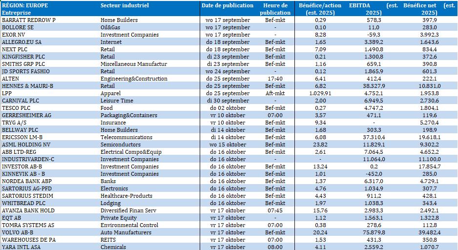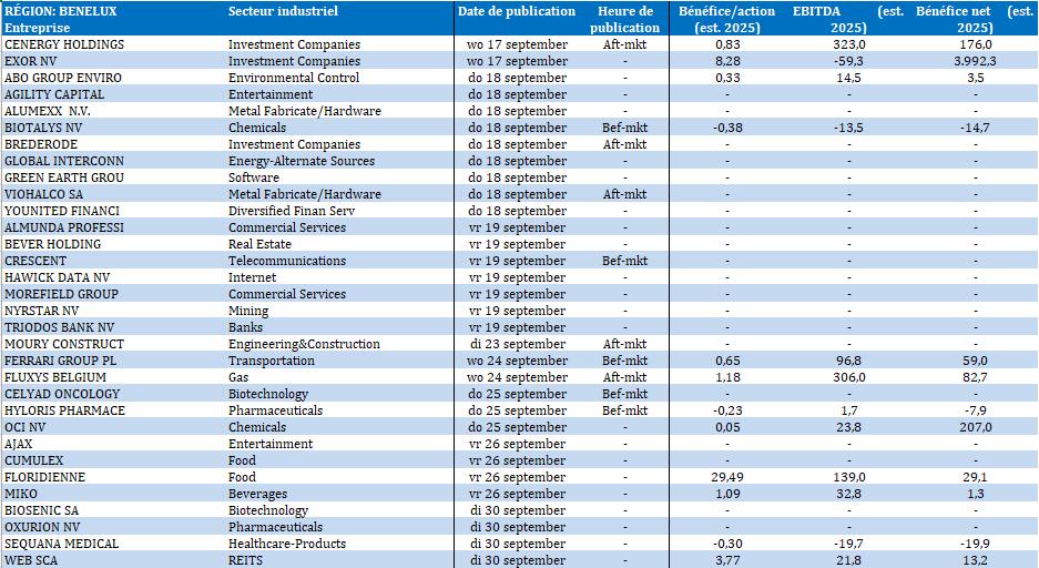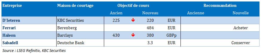 - D'Ieteren {{29282, D'IETEREN GROUP, DIE}} : KBC Securities abaisse l'objectif de cours pour cette holding belge, active notamment dans la réparation de vitres automobiles et les pièces détachées automobiles. Les résultats du 1er semestre 2025 amènent KBC Securities à réviser légèrement à la baisse ses prévisions de bénéfice, avec un bénéfice ajusté avant impôt de 935 millions d'euros. La perspective d’une diminution des marges chez Belron et TVH Parts est partiellement compensée par la baisse des coûts de financement et par un taux de change favorable pour le dollar. L'objectif de cours est abaissé de 225 à 220 euros par action, avec une recommandation « Acheter ».