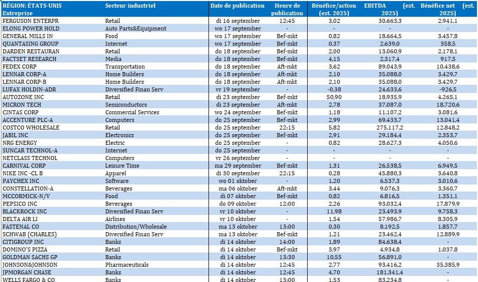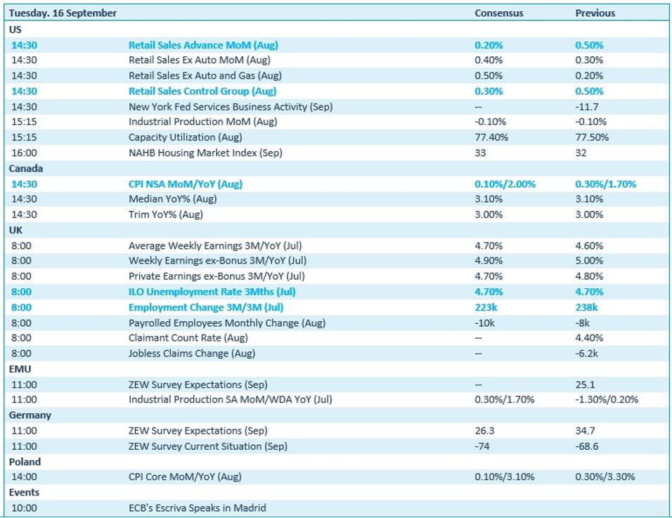 - Le calendrieréconomique est particulièrement chargé aujourd'hui. Aux États-Unis, les marchés s’intéressent tout particulièrement à la révision des données de ventes au détail pour le mois d’août, de même que les statistiques de production industrielle pour le même mois. Au Canada, on attend un aperçu de l'évolution des prix à la consommation. Au Royaume-Uni, on attend la publication des statistiques de chômage pour juillet.