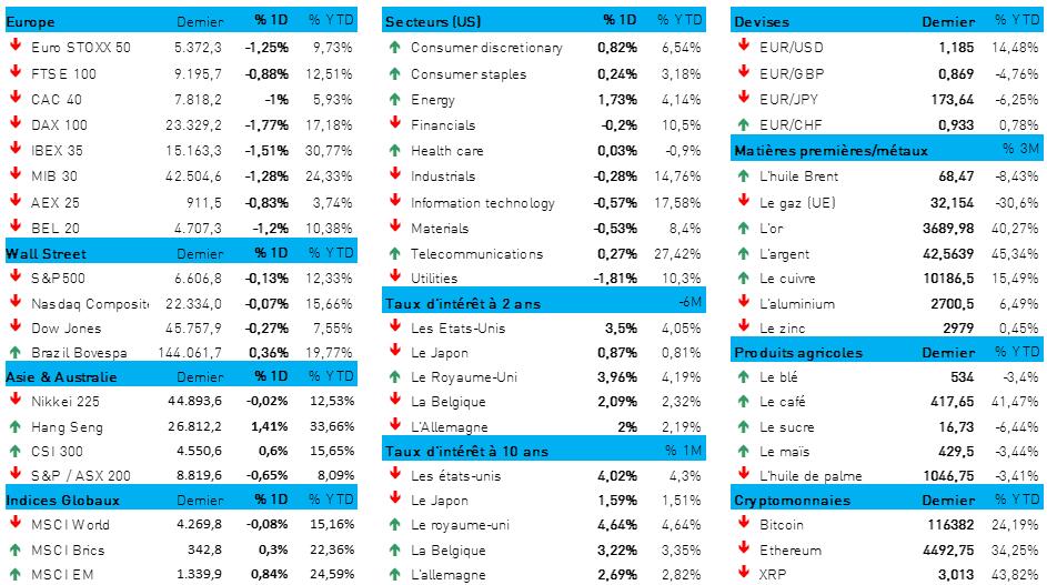 - Sur le plan boursier, Wall Street a bénéficié d'un certain soutien (S&P500 et Nasdaq : -0,1 %) ; de son côté, l'Europe a perdu quelques plumes (-1,1 %). Ce qui n’est pas dénué de logique. Au niveau sectoriel, les valeurs européennes sensibles aux taux d'intérêt (banques et assureurs) se sont retrouvées en queue de peloton : seules les valeurs énergétiques ont réussi à se maintenir à flot (+0,2 %) grâce à une légère hausse du prix du pétrole (68,32 dollars le baril de Brent) induite par les attaques de drones ukrainiens contre des raffineries et des ports russes.