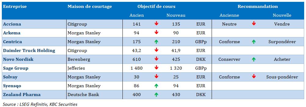 - Syensqo {{443031698, SYENSQO NV, SYENS}} : le spécialiste belge des solutions innovantes en matière de chimie et de matériaux annonce que sa CEO, Ilham Kadri, se retirera le 1er janvier 2026 et laissera sa place à Mike Radossich, qui travaille depuis plus de 30 ans au sein de Syensqo et de ses prédécesseurs. Sous la direction d’Ilham Kadri, l'entreprise a initialement enregistré de solides résultats grâce à l'amélioration des prix nets, mais ces dernières années, le flux de trésorerie d'exploitation (EBITDA) a diminué de 24 % en raison de conditions macroéconomiques défavorables. Quant à Mike Radossich, actuellement responsable des segments Performance & Care et Other Solutions, il prendra la direction de l'entreprise dans une période d'optimisation des coûts et de simplification du portefeuille. L'objectif de cours de KBC Securities reste fixé à 90 euros et la recommandation reste « Acheter ».