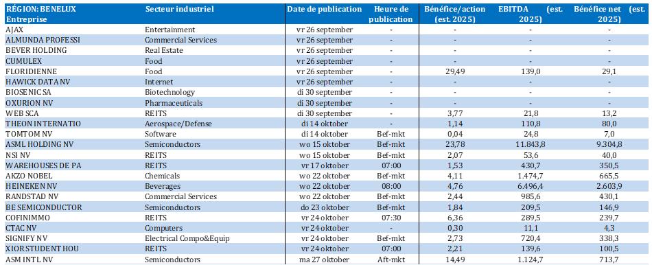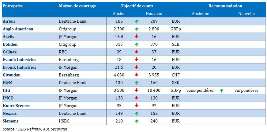 - WEB {{29326, WAREHOUSES ESTATES BELGIUM SCA, WEB}} : la société immobilière belge active dans le commerce de détail, la logistique et les bureaux annonce pour le premier semestre 2025 une baisse de son taux d'occupation, de 97,6 % à 95,0 %, mais revenus locatifs stables de 12,6 millions d'euros. Le bénéfice d'exploitation (EPRA EPS) est inférieur de 3,0 % aux prévisions, probablement en raison de la hausse des charges d'intérêts, ce qui entraîne une révision à la baisse des estimations. WEB mise sur une rotation stratégique de ses actifs, avec une vente à Péruwelz et un achat à Gosselies, et confirme un dividende stable de 3,35 euros. KBC Securities maintient son objectif de cours de 56 euros et sa recommandation « Conserver ».