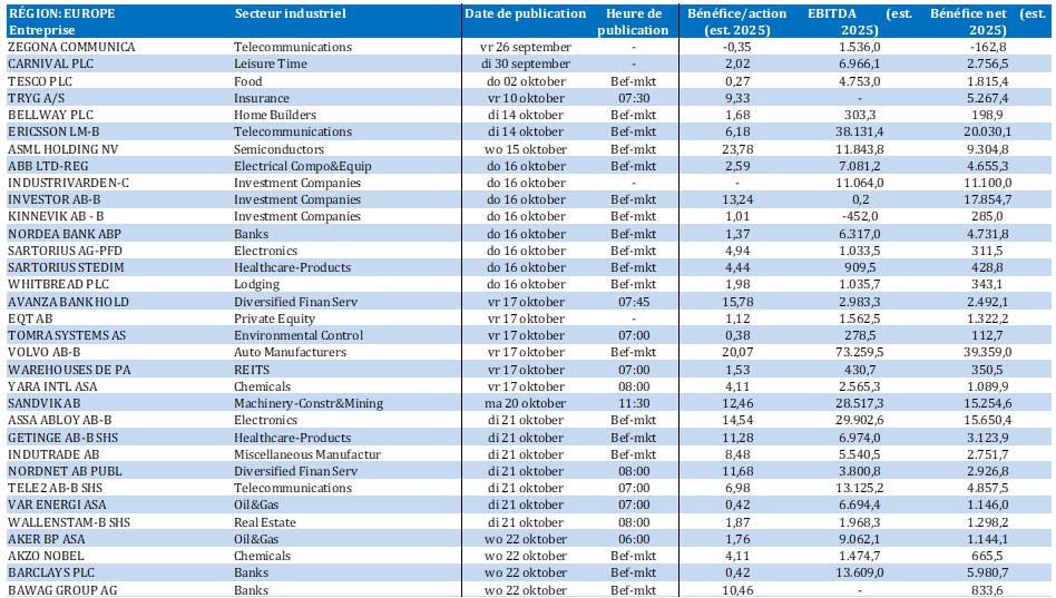 - Volkswagen {{176160, VOLKSWAGEN AG, VOW}} : le constructeur automobile allemand décide de réduire ses volumes et de procéder à des arrêts temporaires de production dans ses usines de véhicules électriques de Zwickau et d'Emden en raison de la faiblesse de la demande, en particulier pour l'Audi Q4 e-tron. L'usine de Zwickau va être mise à l’arrêt pendant une semaine à compter du 6 octobre, tandis qu'à Emden, il a été décidé de réduire le nombre d’heures de travail et d’arrêter temporairement les chaînes de production. La semaine dernière, Volkswagen annonçait une perte de 5,1 milliards d'euros, due au retard pris dans le déploiement des modèles électriques chez Porsche AG. Le groupe souffre des effets d’une baisse de la demande, de la concurrence croissante de la Chine et de l’augmentation des droits d'importation aux États-Unis.