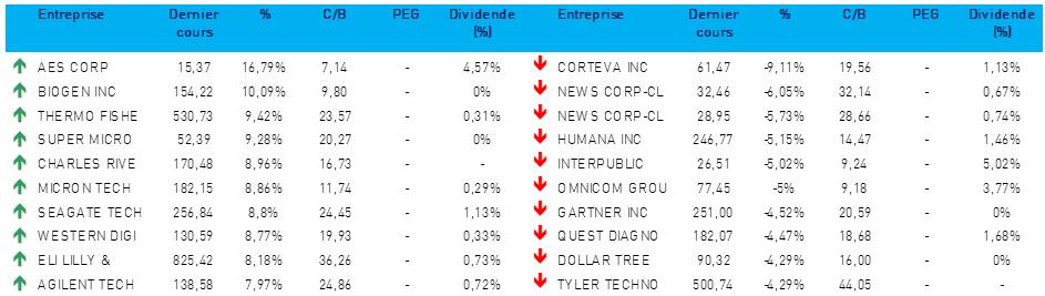 - Le secteur des technologies/des microprocesseurs a également contribué à cette hausse : Micron a gagné environ 9 %, entraînant une hausse de l'indice Philadelphia Chip. On notera aussi l’excellente performance des services aux collectivités, avec une progression d'environ 17 % pour AES grâce à des rumeurs de rachat (BlackRock's Global Infrastructure Partners serait intéressé). Du côté des secteurs les moins performants, notons une sous-performance du secteur des matières premières, sous la pression de facteurs cycliques et de la rotation entre valeurs industrielles et valeurs du secteur des matières premières.