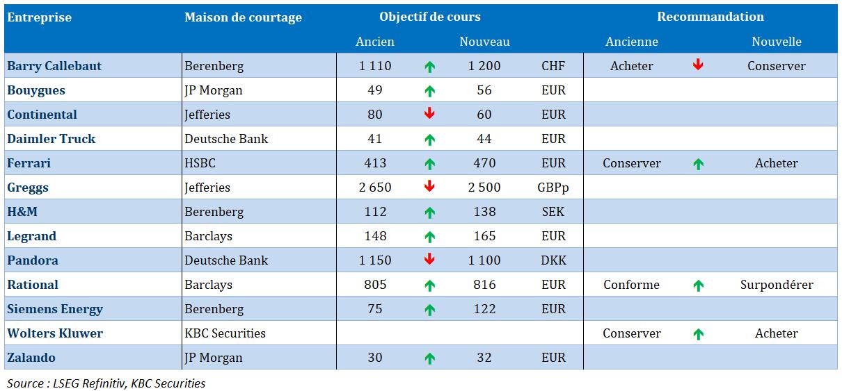 - Galapagos {{11778399, GALAPAGOS NV, GLPG}} : cette biotech belgo-néerlandaise a reçu de la part d'investisseurs financiers, principalement, un nombre limité d'offres d'achat non contraignantes pour sa division de thérapie cellulaire. La date limite pour le dépôt d’offres contraignantes et entièrement financées est fixée pour les prochaines semaines, après quoi Galapagos communiquera, au plus tard le 5 novembre 2025, le résultat du processus de révision stratégique. Dans le cas d’une vente, la direction serait en mesure de se concentrer pleinement sur la constitution d'un nouveau pipeline autour de la virologie, de l'oncologie et de l'immunologie, conformément aux priorités de Gilead. KBCS propose un objectif de cours de 37 euros avec une recommandation « Accumuler ».