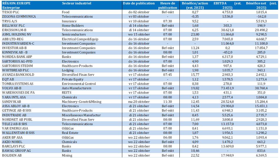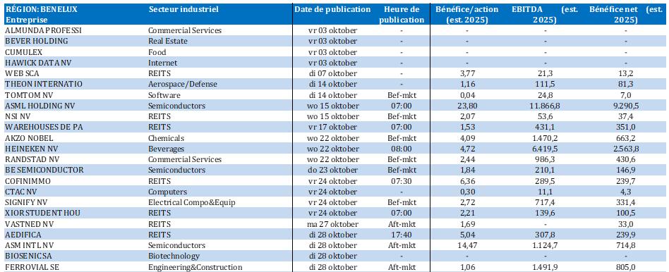 - Exmar {{7489879, EXMAR NV, EXM}} : le 1er octobre 2025, la compagnie maritime belge a reçu de l'actionnaire de référence Saverex une demande visant à convoquer une assemblée générale extraordinaire. Le seul point à l'ordre du jour de cette AGE serait la proposition de distribution d'un dividende brut intermédiaire de 0,59 euro par action. Cette proposition fait suite au versement d'un dividende brut de 4,07 euros au cours de l'été. Le dividende net s'élèverait à 0,413 euro par action après déduction du précompte mobilier de 30 %. L'objectif de cours et la recommandation sont suspendus.