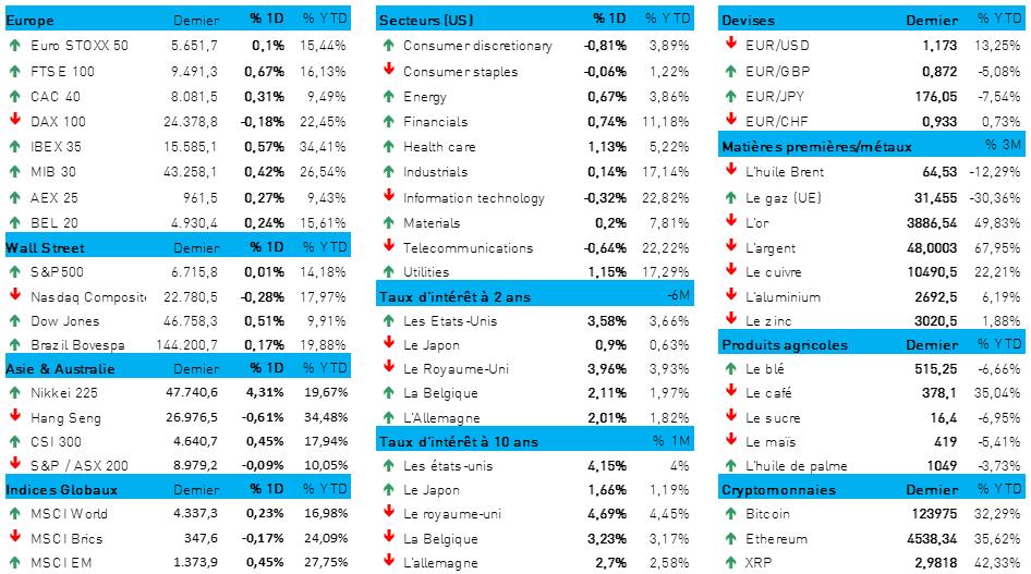 - En Europe, les marchés boursiers ont évolué dans un contexte plus confiant : à la clôture, l’indice STOXX 600 atteignait un nouveau niveau record, porté par la vigueur des secteurs des entreprises technologiques et des fabricants de microprocesseurs (ASML, ASMI), du secteur automobile (forte progression de Stellantis) et des secteurs défensifs. La dynamique observée dans le secteur des puces électroniques et des technologies était présente dans toutes les régions, avec des acheteurs attirés par l'IA et par l'optimisme relatif aux semi-conducteurs.