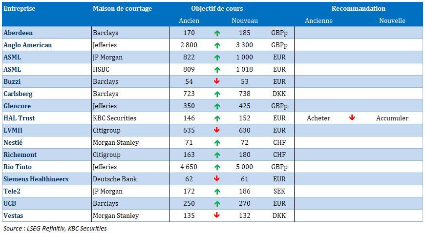 - HAL Trust {{29796, HAL TRUST, HAL}} : KBC Securities relève l'objectif de cours de ce fonds d'investissement néerlandais, mais abaisse sa recommandation. Hal Trust gère un portefeuille prestigieux comprenant diverses entreprises maritimes telles que Boskalis, Vopak et SBM Offshore, complété par des noms tels que Coolblue et Siltronic. Malgré un rendement historique impressionnant, le cours de l'action a baissé de plus de 20 % depuis 2016 et s'échange actuellement avec une décote de 24 % par rapport à sa valeur comptable. L’intérêt des investisseurs pour ce titre est tempéré par plusieurs facteurs, à savoir notamment une trésorerie de 2 milliards d'euros, une structure complexe entre les Bermudes et les Pays-Bas et une pression fiscale accrue. KBC Securities fixe désormais un objectif de cours de 152,0 euros (au lieu de 146 euros) avec une recommandation « Accumuler » (au lieu de « Acheter »).