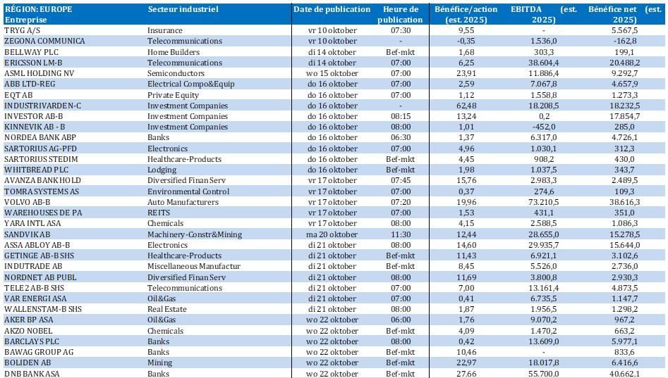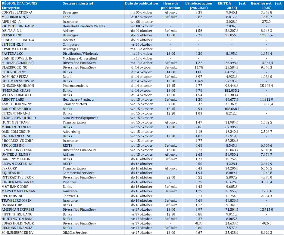 - Pour cette semaine, les attentes portent principalement sur la réaction des marchés à l'absence d’indicateurs économiques, de signaux politiques et de résultats d'entreprises. Des sociétés telles que PepsiCo, Delta Air Lines et Levi Strauss sont au programme et pourraient donner des indications dans un environnement macroéconomique calme. En Asie, on notera le nom de Sanae Takaichi, qui s'impose à la tête du parti au pouvoir au Japon, et s'apprête à devenir Première ministre, pour appliquer très probablement une politique budgétaire et monétaire expansionniste. Il n’est pas exclu que le yen et les actifs japonais deviennent bientôt des points chauds de volatilité.