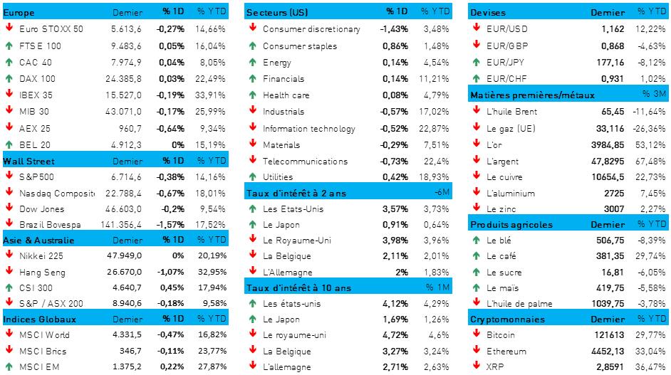 - En d'autres termes, le secteur technologique reste très demandé, dans une conjoncture où la banque centrale américaine vient d'entamer un cycle de baisse des taux d'intérêt. On se demande ce qui pourrait arriver de négatif, pas vrai ? À l’échelle mondiale, les marchés d’actions restent proches de leurs records, grâce à l'optimisme lié à la possibilité que la Réserve fédérale baisse encore son taux directeur. En Europe, l'Euro Stoxx a perdu 0,2 %, le CAC 40 a progressé de 0,04 % et le BEL20 est resté stable. À Wall Street, le S&P 500 a reculé de 0,4 % et le Nasdaq, de 0,7 %.