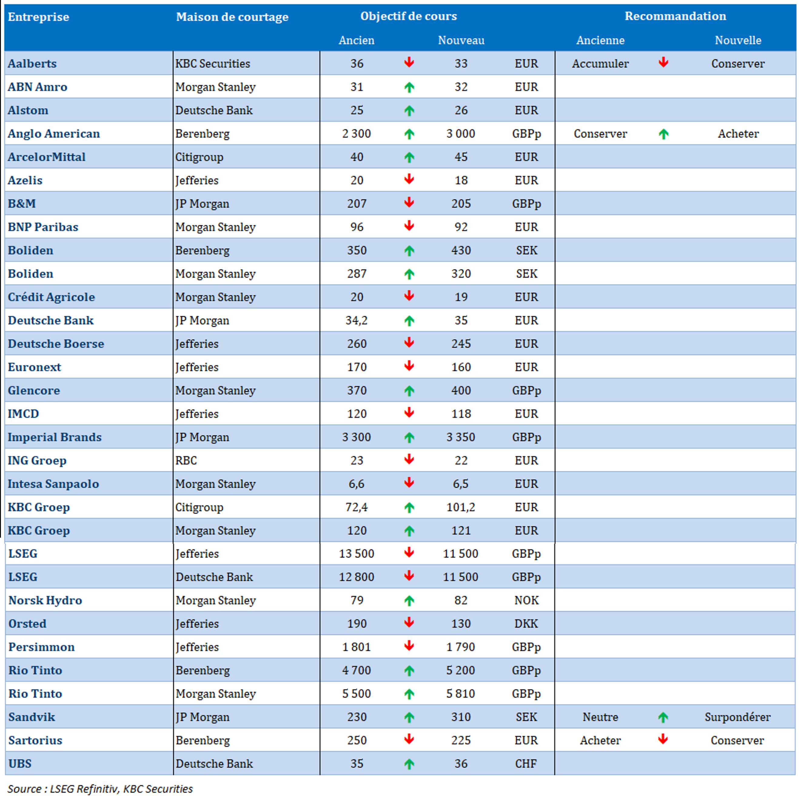 - Tessenderlo {{29234, TESSENDERLO GROUP NV, TESB}} : lors de sa journée Analyst & Asset Manager Day à Ypres, l'entreprise a confirmé ses prévisions pour l'exercice 2025. Le CEO, Luc Tack, a souligné que Tessenderlo avait adopté une approche d'allocation de capitaux plus stricte, laissant entendre qu'aucune activité du portefeuille n'était intouchable. L'accord avec Darling Ingredients relativement aux activités gélatine et collagène devrait être finalisé au second semestre 2026. La société reste appréciée pour son flux de trésorerie disponible sain, son bilan solide et sa valorisation attrayante. KBC Securities maintient sa recommandation « Accumuler » et son objectif de cours de 28 euros.