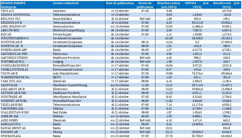 - BMW {{143094, BAYERISCHE MOTOREN WERKE AG, BMW}} : les ventes mondiales du constructeur automobile allemand ont augmenté de 8,8 % au troisième trimestre, à 588 300 véhicules, grâce à de solides performances en Europe et aux États-Unis. Les ventes ont augmenté de 9,3 % en Europe, et de 24,9 % aux États-Unis. Ces chiffres favorables contrastent avec ceux de son concurrent Mercedes, qui est confronté à une baisse des ventes due aux droits d'importation américains et à une concurrence accrue en Chine.