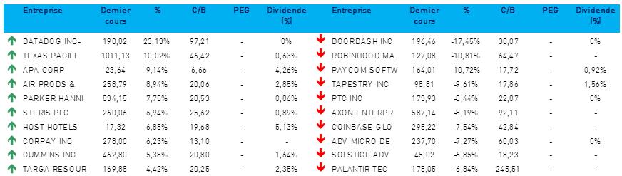 - Duolingo {{346445665, DUOLINGO INC, DUOL}} : le cours de cette entreprise d'edtech a chuté à 205 dollars, soit une baisse de 52 % par rapport au pic atteint plus tôt cette année, malgré de solides résultats trimestriels. Le chiffre d'affaires a pourtant augmenté de 41 % à 271 millions de dollars et le nombre d'abonnés payants a progressé de 24 % à 11,5 millions. De plus, le bénéfice a atteint le niveau de 292 millions de dollars grâce à un avantage fiscal ponctuel. La réaction négative des investisseurs s’explique par le niveau médiocre des perspectives, dans la mesure où Duolingo compte se concentrer désormais sur la croissance à long terme et sur le nombre d'utilisateurs plutôt que sur ses revenus immédiats. Les analystes soulignent que l'action est peut-être injustement pénalisée compte tenu de ses solides chiffres de croissance et de sa rentabilité.