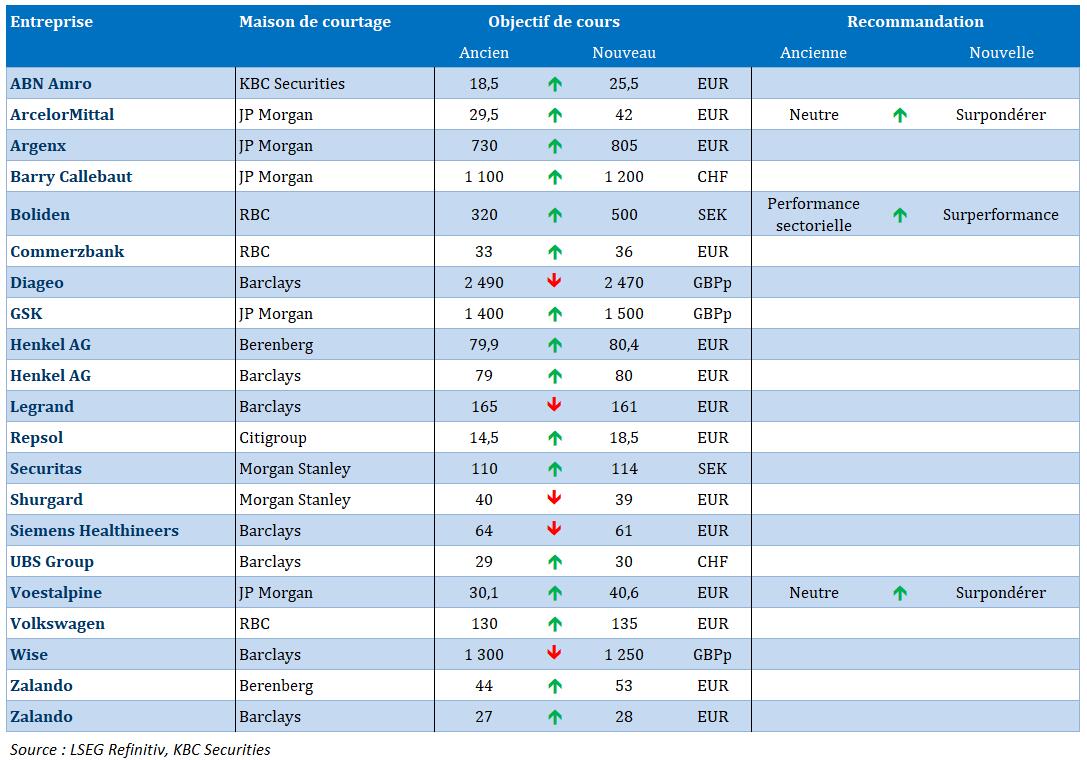 - UCB {{29331, UCB SA, UCB}} : la société procède à une réorganisation stratégique de son équipe de direction : Fiona du Monceau devient Executive Vice President & Chief Commercial Officer, tandis qu'Emmanuel Caeymaex assume le rôle de Executive Vice President, Head of Patient Evidence. Ce changement prendra effet le 1er janvier 2026, avec une période de transition qui prendra cours immédiatement de manière à assurer la continuité. KBCS maintient sa recommandation « Accumuler » et son objectif de cours de 270 euros.