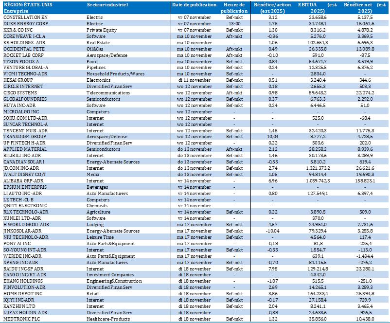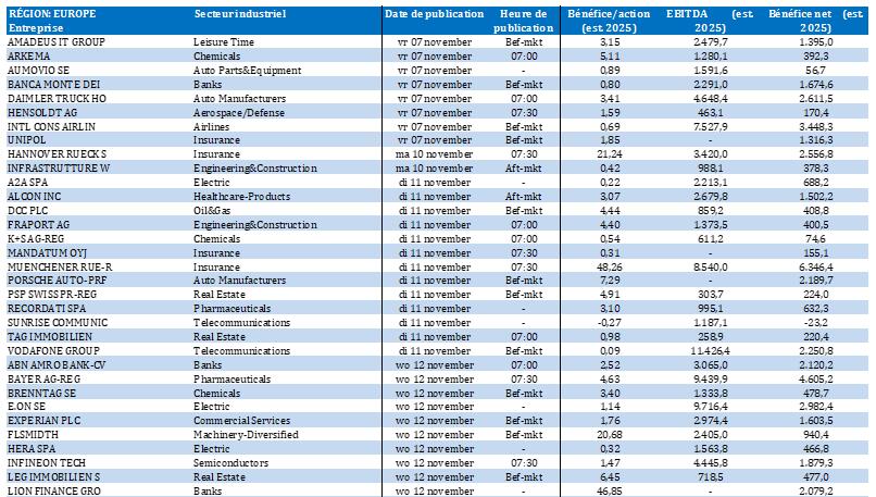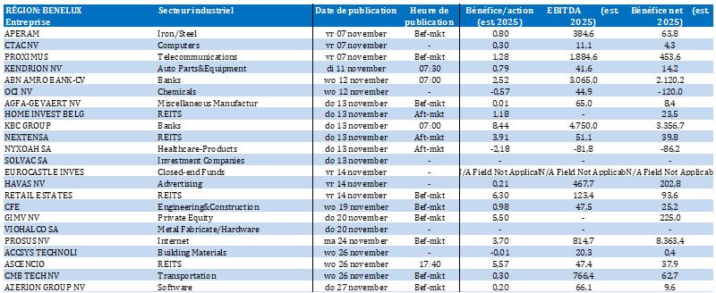 - Proximus {{9421550, PROXIMUS SA, PROX}} : le groupe de télécommunications belge a enregistré de solides performances commerciales sur ses marchés domestiques au troisième trimestre, avec +45 000 cartes mobiles postpayées et +12 000 lignes Internet, tandis que le déploiement de la fibre optique a atteint 2,5 millions de foyers et d'entreprises connectables (47 % de couverture). L'EBITDA sur les marchés domestiques augmente de 1,8 % en glissement annuel. En revanche, le chiffre d'affaires du groupe diminue de 5,4 % et l'EBITDA, de 1,0 %, principalement en raison d'une baisse de 25,1 % chez Proximus Global. La prévision d'EBITDA « groupe » est maintenue, et la prévision de flux de trésorerie organique pour 2025 est revue à la hausse à environ 100 millions d'euros. En revanche, les dépenses d'investissement sont ramenées à 1,25 milliard d'euros.