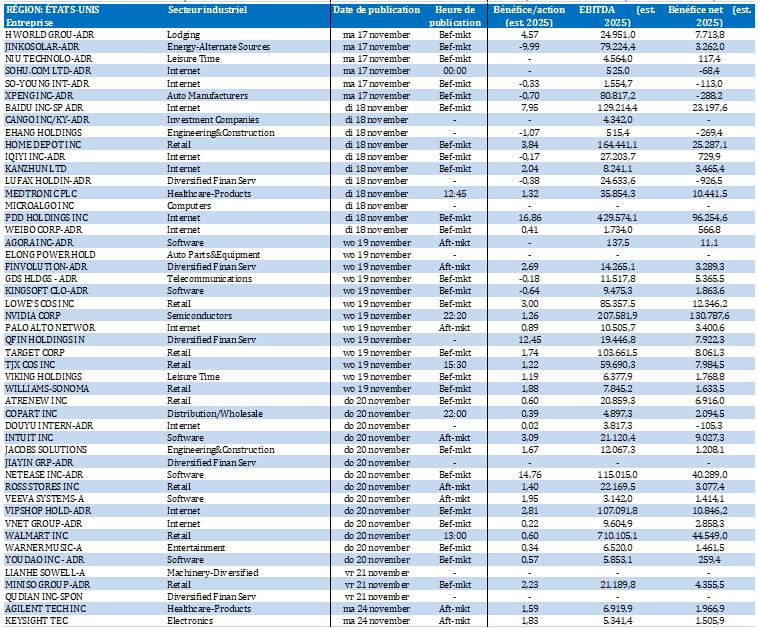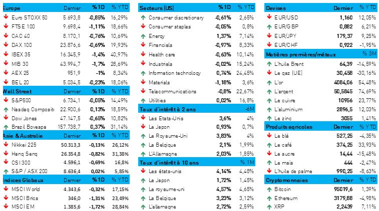 - Alors que les marchés d’actions européens (-1 %) restaient englués dans les effets de la correction des derniers jours, de l’existence potentielle d’une bulle de l'IA et de la crainte de voir la banque centrale américaine interrompre son audacieuse tendance à la baisse des taux, le sentiment s'est progressivement amélioré à Wall Street au fil de la journée. L’indice S&P 500 a défendu ses positions avec brio (-0,05 %), et le Nasdaq a même enregistré un gain de 0,13 %. Sera-t-il possible de présenter un rapport analogue vers la fin de cette semaine ? C’est loin d’être acquis : les marchés attendent notamment les résultats trimestriels de Nvidia ; Trump va devoir se dépêtrer des pressions liées à l'affaire Epstein et la Commission européenne publie ses prévisions économiques pour l'automne.