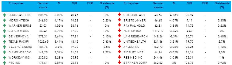 - StubHub {{524734390, STUBHUB HOLDINGS INC, STUB}} : cet opérateur de billetterie a chuté de 19 % après l’annonce, pour le troisième trimestre, d’une perte nette de 1,33 milliard de dollars, soit 4,27 dollars par action – à comparer à une perte nette de 45,9 millions de dollars, soit 0,15 dollar par action, à la même période l'année dernière. StubHub impute cette perte à une charge exceptionnelle liée à des rémunérations en actions versées à l’occasion de son introduction en bourse. Le CEO, Eric Baker, a déclaré lors d'une visioconférence que la société ne comptait pas présenter de prévisions pour le trimestre en cours.