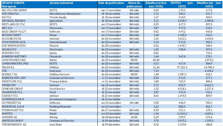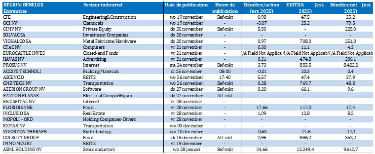 - ASML {{63480, ASML HOLDING NV, ASML}} : la société ne prévoit pas d'impact à court terme des tensions entre les Pays-Bas et la Chine concernant l'acquisition de Nexperia. Selon le CEO, Christophe Fouquet, le pire de la crise semble relever du passé, malgré certaines perturbations dans l'approvisionnement en microprocesseurs pour le marché automobile. Il souligne l'importance du dialogue avant toute escalade, regrettant que cela n’ait pas été le cas jusqu'à présent. Une délégation néerlandaise se rendra en Chine la semaine prochaine pour poursuivre les discussions.
