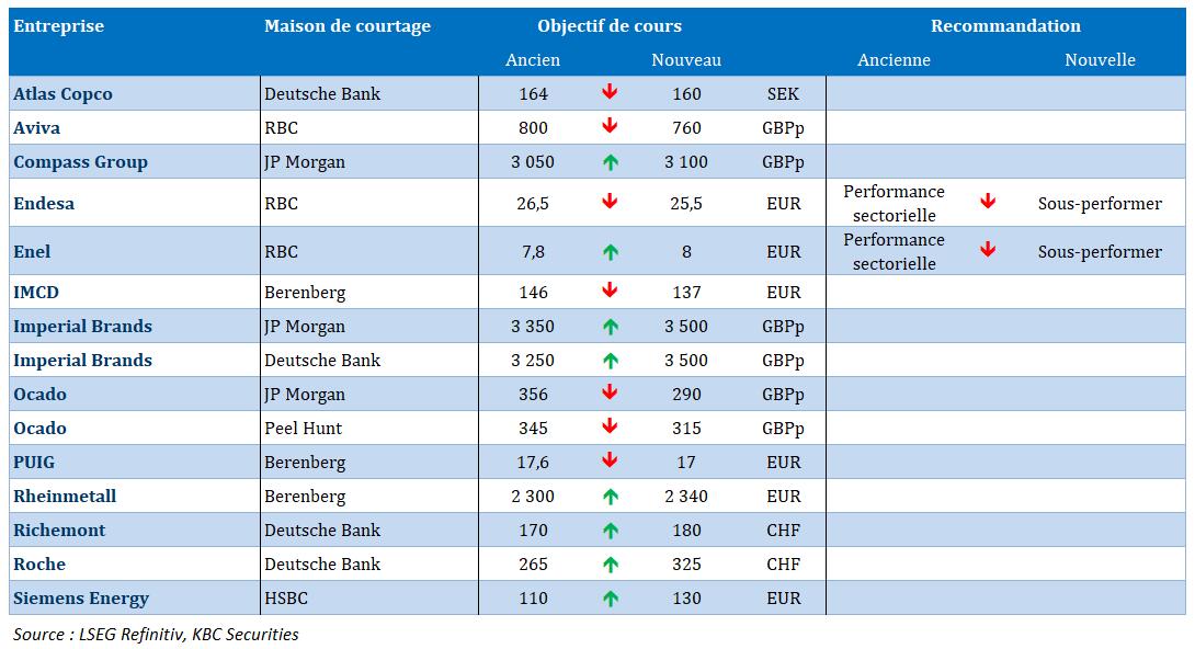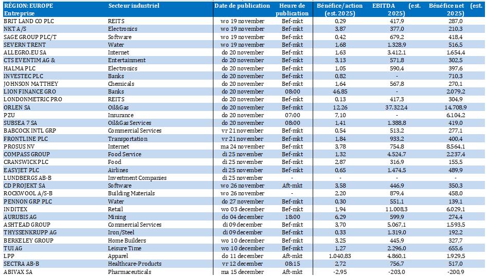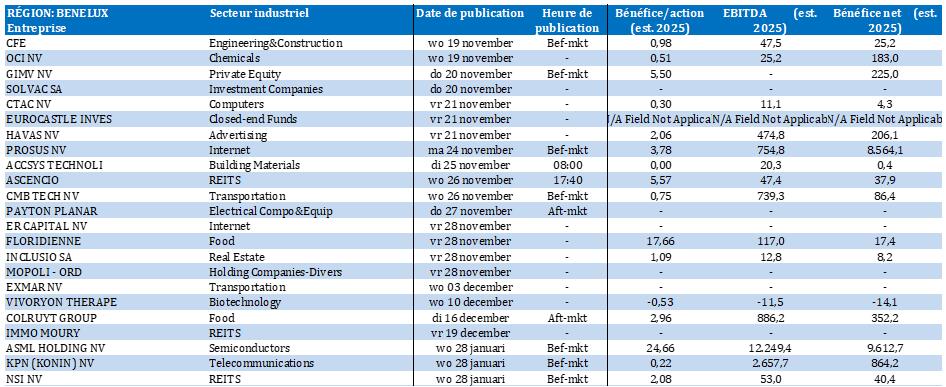 - CFE {{29208, CIE D'ENTREPRISES CFE SA, CFEB}} : sur les neuf premiers mois de 2025, l'entreprise a réalisé un chiffre d'affaires de 768,7 millions d'euros, en recul de 11,3 % par rapport à l'an dernier. Le carnet de commandes consolidé reste stable à 1 650 millions d'euros, avec une augmentation de 25 % dans le pôle Multitechnics et une baisse de 5 % dans le pôle Construction & Renovation. La société confirme sa prévision de baisse du chiffre d'affaires annuel, pour un bénéfice net proche du niveau de 2024. Compte tenu de la solidité du carnet de commandes et d’un niveau d'endettement net historiquement bas, KBCS maintient sa recommandation « Acheter » et l'objectif de cours de 15 euros.