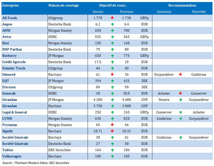 - Home Invest : la société immobilière a acquis le projet résidentiel « Jardin Leopold » à Laeken. La transaction porte sur un terrain doté de 2 vieux hangars et assorti d’un permis de construire. Home Invest y construira un nouveau projet de 56 appartements. L'investissement total s'élève à environ 18,0 millions d'euros, pour un rendement initial brut estimé à environ 4,7 %. Le projet devrait être achevé fin 2026. Aucun impact sur la recommandation « Conserver » ni sur l'objectif de cours de 18 euros.