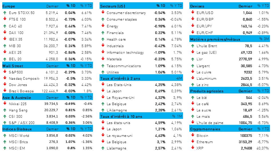 - Donc non, il n’y a aucune raison de se plaindre, puisque la série de records se poursuit sans relâche. C’est nettement moins vrai pour les cryptomonnaies, qui ont dû absorber cette nuit une chute : l'éther a perdu quelque 6,5 %, le bitcoin, 4 % (à 100 346 dollars) et Cardano pas moins de 10 %. Et cette tendance semble devenir la norme, puisque sur la base des contrats à terme (très matinaux), le Nasdaq semble se diriger actuellement vers un recul de 2 % à l'ouverture. Des taches sur un parcours autrement sans faille ? Ou simplement la conviction qu’il est temps de prendre quelques bénéfices ? L'avenir nous le dira...
