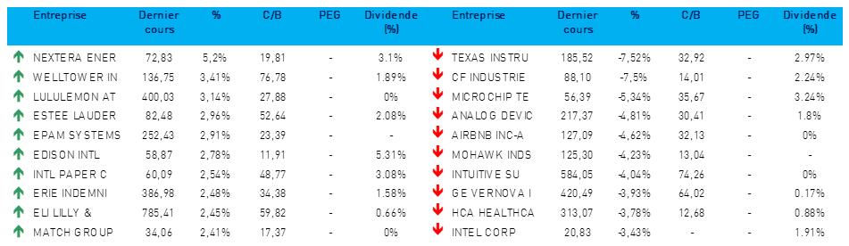 - NextEra Energy {{37227220, NEXTERA ENERGY INC., NEE}} : le producteur d'énergie renouvelable a réalisé un bénéfice trimestriel de 0,53 dollar par action, dépassant le consensus (0,51 dollar par action). Ce chiffre est à comparer au bénéfice de 0,52 dollar par action enregistré l’année précédente. Sur le plan du bénéfice, ce rapport trimestriel annonce une surprise de 3,92 %. Le chiffre d’affaires de NextEra s’établit à 5,39 milliards de dollars, contre 6,88 milliards de dollars l'an dernier. Au cours des quatre derniers trimestres, l'entreprise n'a pas réussi à dépasser les estimations de chiffre d’affaires du consensus.