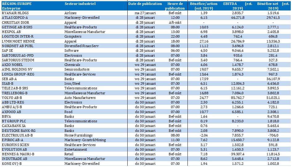 - Ryanair {{17060401, RYANAIR HOLDINGS PLC, RYA}} : pour le trimestre clos le 31 décembre, la compagnie aérienne irlandaise à bas coût enregistre un bénéfice après impôt qui dépasse les attentes des analystes. Elle révise cependant à la baisse ses prévisions de nombre de passagers en raison de retards dans les livraisons de nouveaux appareils par Boeing. Le bénéfice après impôt du troisième trimestre s'élève à 149 millions d'euros, soit un montant nettement supérieur au bénéfice prévu de 60 millions d'euros. Ce résultat s’explique essentiellement par une hausse inattendue (de 1 %) du tarif moyen au cours du trimestre, au lieu de la baisse de 7 % observée au trimestre précédent. Ryanair s'attend désormais à recevoir neuf Boeing 737 MAX pour la haute saison, soit moins que prévu, et abaisse donc ses prévisions de fréquentation (nombre de passagers) pour l'exercice jusqu’au 31 mars 2026 à 206 millions d’unités.