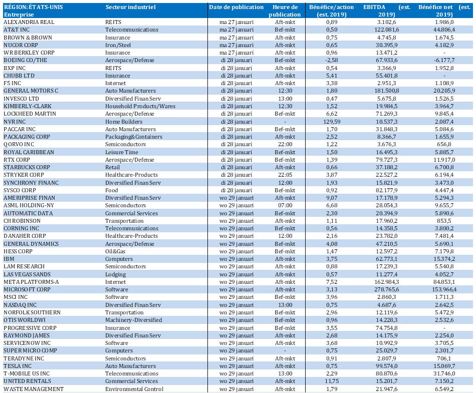 - American Express {{253252, AMERICAN EXPRESS CO., AXP}} : l’action de ce spécialiste des cartes de crédit a chuté après que l’annonce que la croissance des revenus prévue pour 2025 est inférieure à celle qui était prévue pour 2024. Toutefois, American Express affiche au quatrième trimestre un chiffre d'affaires supérieur aux prévisions et un bénéfice conforme aux attentes des analystes. Le chiffre d'affaires du groupe atteint le chiffre record de 65,9 milliards de dollars, en hausse de 10 %, ainsi qu’un bénéfice net record de 10,1 milliards de dollars (soit un bénéfice par action de 14,01 dollars), en hausse de 25 % par rapport à l'an dernier. La société va verser un dividende d’un montant plus élevé, passant de 0,70 dollar à 0,82 dollar.