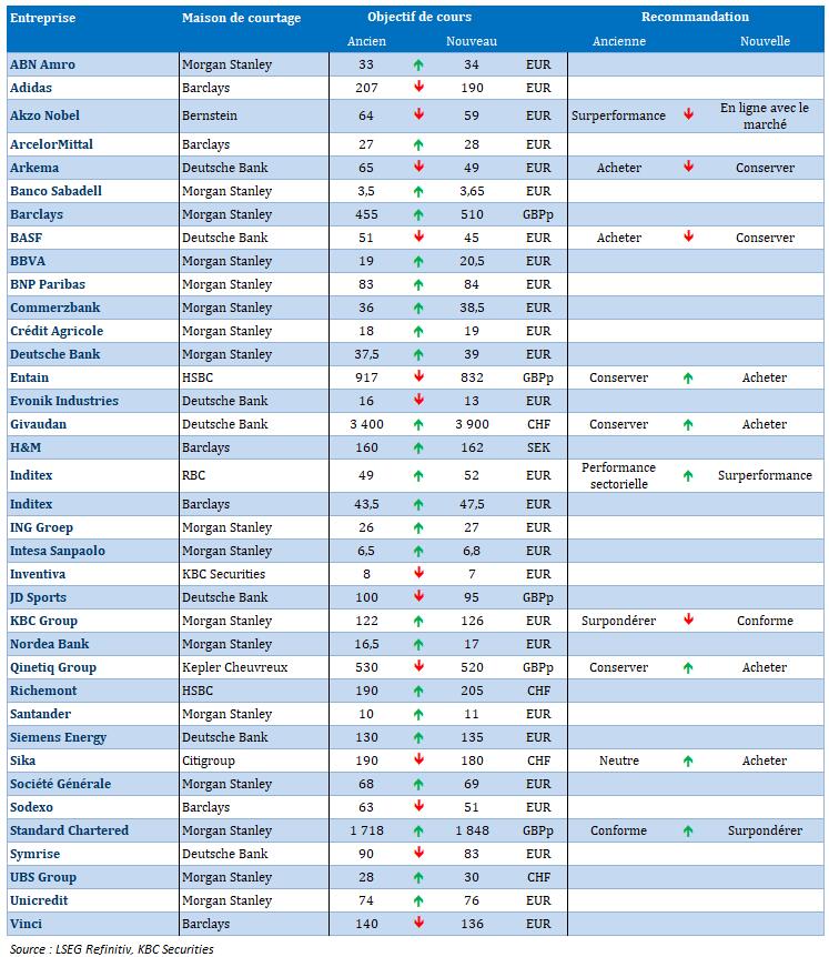 - EVS {{29329, EVS BROADCAST EQUIPMENT SA, EVS}} : en glissement annuel, le chiffre d'affaires du fournisseur belge de technologies de diffusion et de médias pour le troisième trimestre 2025 affiche une croissance soutenue par un important afflux de commandes pour le quatrième trimestre. L’entreprise peut donc confirmer son objectif de chiffre d'affaires pour l'exercice, malgré l’allongement de certains délais de livraison et donc malgré le report, de 2025 à 2026, de l’exécution de certaines commandes. L'intégration de la nouvelle solution T-Motion au quatrième trimestre crée un chiffre d'affaires supplémentaire, avec des marges qui restent solides et des coûts bien maîtrisés. EVS maintient son objectif d'EBIT et voit dans le bas de la fourchette un scénario de base, doté d’un potentiel de hausse en cas de commandes supplémentaires. KBCS maintient sa recommandation « Acheter » et son objectif de cours de 45 euros.