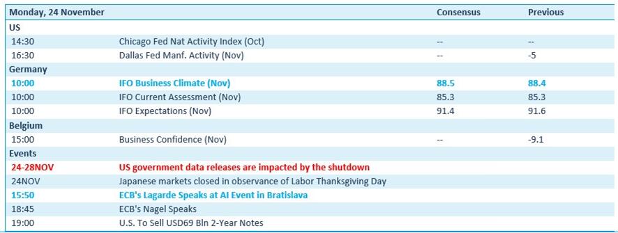 - Au cœur des échanges, on observe un certain retour au calme. À propos de l'IA, d’abord : peut-être y a-t-il finalement de la valeur dans l'IA, auquel cas les valorisations actuelles ne seraient finalement pas si exubérantes ? À propos de l’évolution des taux d'intérêt ensuite : à en croire John C. Williams, membre du conseil des gouverneurs de la Fed, une baisse du taux directeur aux États-Unis serait finalement justifiée – même si les dirigeants de l’institution, toujours « avides de données », ne savent plus vraiment quoi penser). À cela s'ajoute l’actualité géopolitique : les États-Unis et l'Ukraine sont en pourparlers pour élaborer un plan appelant à la fin du conflit avec la Russie, après un consensus visant à modifier une proposition antérieure trop favorable à Moscou (mais n'est-ce pas le cas de tous les plans qui seront présentés ?).