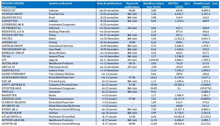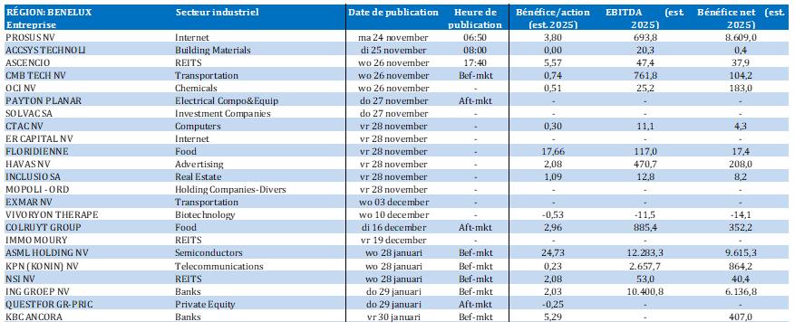 - Exmar {{7489879, EXMAR NV, EXM}} : cette compagnie maritime belge, spécialisée dans le transport de gaz et les services maritimes annonce que l’assemblée générale extraordinaire a autorisé la distribution de la prime d'émission disponible et d’un dividende brut intermédiaire, payables tous deux le 28 novembre 2025. La date ex-dividende a été fixée au 26 novembre, suivie de la date d'enregistrement le 27 novembre. En raison de son implication dans le processus de radiation du titre, la suspension des rapports d’analyse de KBCS est maintenue.