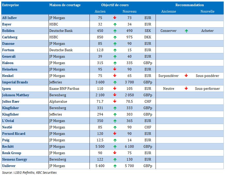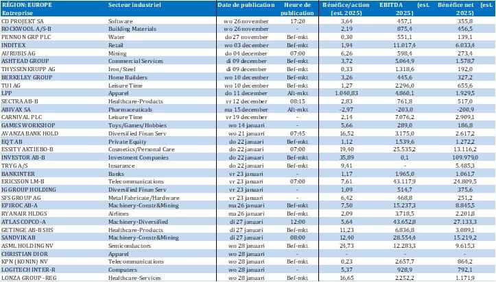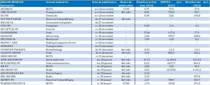 - CMB.TECH{{10872444, CMB.TECH NV, CMBT}} : le groupe maritime belge confirme avoir conclu depuis son rapport intermédiaire du 20 octobre des contrats supplémentaires d’affrètement de pétroliers et de vraquiers à des tarifs amplement supérieurs au seuil de rentabilité (le nombre de contrats dont le tarif a été fixé pour le 4e trimestre est déjà passé d'environ 44 % à environ 80 %). Au troisième trimestre, le bénéfice net s’élève à 17 millions de dollars, soit 0,07 dollar par action, et l'EBITDA ajusté – corrigé de 39 millions de dollars de plus-values sur les ventes de navires – à 199 millions de dollars, dépassant les prévisions de 189 millions. Le carnet de commandes reste stable à 2,95 milliards de dollars et le groupe annonce à nouveau un dividende intermédiaire de 0,05 dollar par action. KBCS maintient sa recommandation « Acheter » et son objectif de cours de 11 euros.