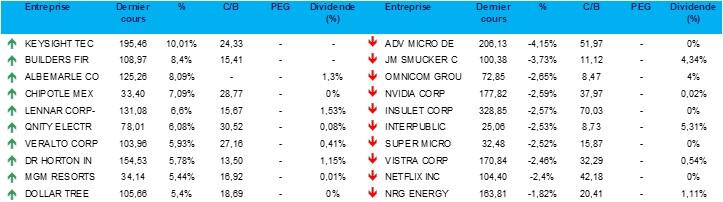 - Symbotic{{382607228, SYMBOTIC INC, SYM}} : (+39,36 %) l’action de ce spécialiste américain de l'automatisation d’entrepôts a grimpé en flèche après la publication des résultats de son quatrième trimestre (décalé). Le chiffre d'affaires s’élève à 618 millions de dollars (conformément aux attentes de Wall Street), au lieu de 565 millions de dollars à la même période l'an dernier. L'amélioration de la marge et des flux de trésorerie a renforcé la confiance des investisseurs. Avec une valorisation de 6,3 milliards de dollars et une forte concentration sur les technologies d'automatisation de bout en bout, Symbotic reste bien positionné dans un secteur en rapide évolution, malgré une forte volatilité.