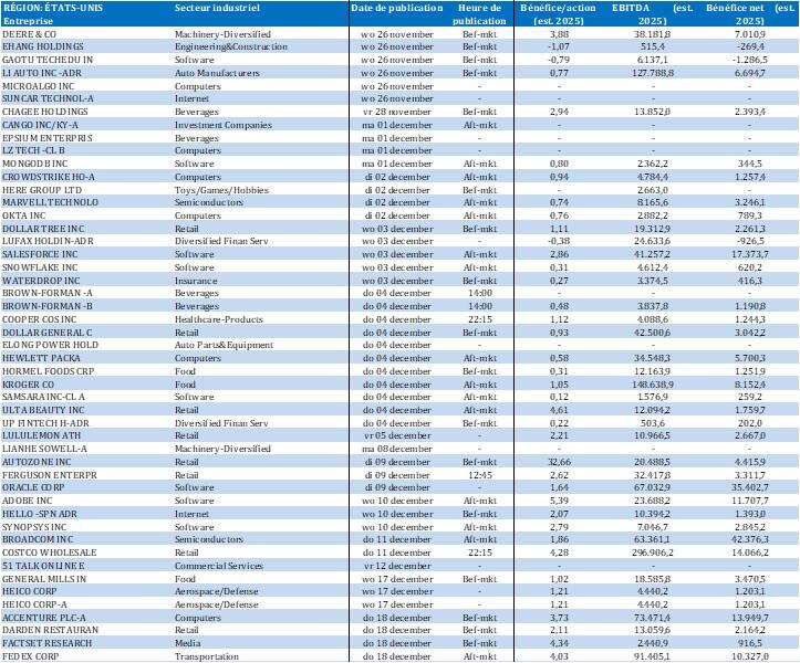 - Best Buy{{255770, BEST BUY CO. INC., BBY}} : (+5,34 %) ce détaillant américain de produits électroniques publie pour le troisième trimestre de son exercice décalé, un chiffre d'affaires de 9,7 milliards de dollars et un bénéfice par action ajusté de 1,40 dollar, soit une hausse de 11 % en glissement annuel. Le groupe annonce une augmentation de ses ventes comparables (+2,7 %) grâce à une forte demande en ordinateurs, jeux vidéo et téléphones mobiles. En outre, des initiatives telles que le lancement des lunettes Meta AI et des boutiques IKEA contribuent à l'amélioration de la marge brute. Best Buy, qui a réalisé en 2024 un chiffre d'affaires consolidé supérieur à 41 milliards de dollars, détient environ 8 % du marché nord-américain de l'électronique, et continue d'investir dans le commerce électronique et les stratégies « omnicanal ».