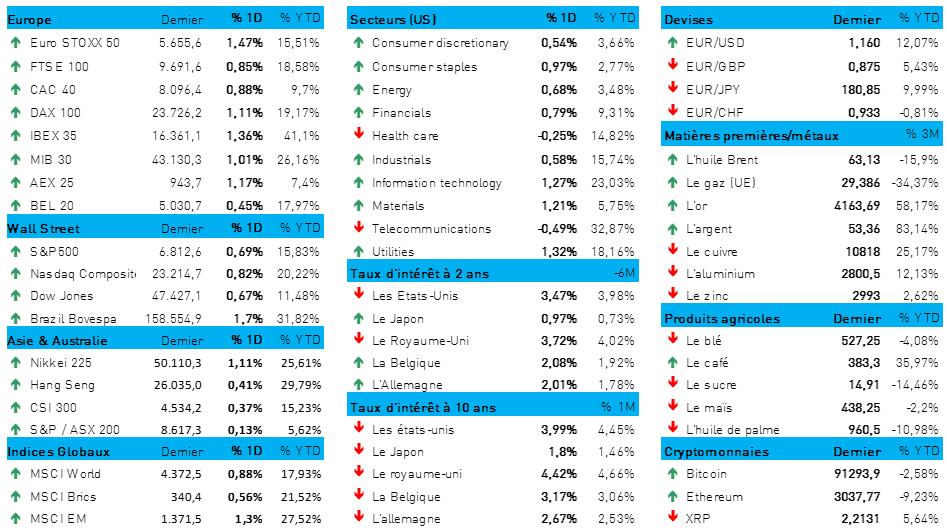 - Hier, les marchés boursiers mondiaux ont continué de digérer la baisse des jours précédents, et tant l'Euro Stoxx 600 (+1,1 %), l’indice S&P 500 (+0,7 %) que le Nasdaq (+0,8 %) ont pu se rapprocher à nouveau de leurs précédents records. En Asie aussi, les machés d’actions ont réalisé une bonne performance cette nuit : l’indice MSCI Asia-Pacific a progressé de 0,4 %, soutenu par le Nikkei (+0,4 %), par le Kospi (Corée du Sud, +0,7 %) et par les indices chinois et hongkongais (+0,6 %).