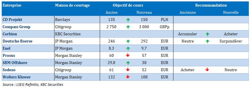 - Ascencio {{16907245, ASCENCIO SA, ASCE}} : ce promoteur belge annonce pour 2025 un bénéfice EPRA par action de 5,56 euros, légèrement inférieur à la moyenne des prévisions des analystes (5,66 euros), en raison d’une baisse des revenus locatifs et d’une hausse de ses coûts. Malgré une augmentation du taux d'occupation et une baisse du coût de financement (+1,4 % en glissement annuel), des révisions négatives des loyers et la hausse des charges immobilières ont pesé sur la marge opérationnelle, à 81,8 %. La société conserve un profil de financement solide, favorable à une croissance modérée du BPA et du DPA, avec un multiple prévisionnel de 9,0 x. KBCS émet une recommandation « Conserver » et un objectif de cours de 52 euros.