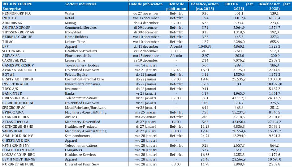 - Novo Nordisk {{7239032, NOVO NORDISK A/S, NOVO B}} : le laboratoire pharmaceutique danois produit notamment le semaglutide, commercialisé sous les noms Ozempic et Wegovy. Selon les analystes, le groupe prévoit que les réductions de prix de 85 % imposées par Medicare aux États-Unis n’auront qu’un impact limité sur son chiffre d'affaires. Les nouveaux prix, qui entreront en vigueur en 2027, ont été amplement pris en compte dans les estimations et apportent une certaine clarté pour les médicaments GLP-1 tels que Wegovy et Zepbound d'Eli Lilly. Pour le médicament Austedo, du groupe israélien Teva Pharmaceuticals, la baisse de prix s’élève à 38 %, soit une réduction inférieure à la moyenne des prévisions des analystes (environ 45 %). AbbVie a enregistré des réductions plus importantes sur Linzess et Vraylar. Les analystes estiment que les baisses de prix relatives à Novo pourraient réduire son chiffre d'affaires d'environ 6 milliards de couronnes danoises. AstraZeneca et GSK ont déjà entièrement révisé leurs prévisions.