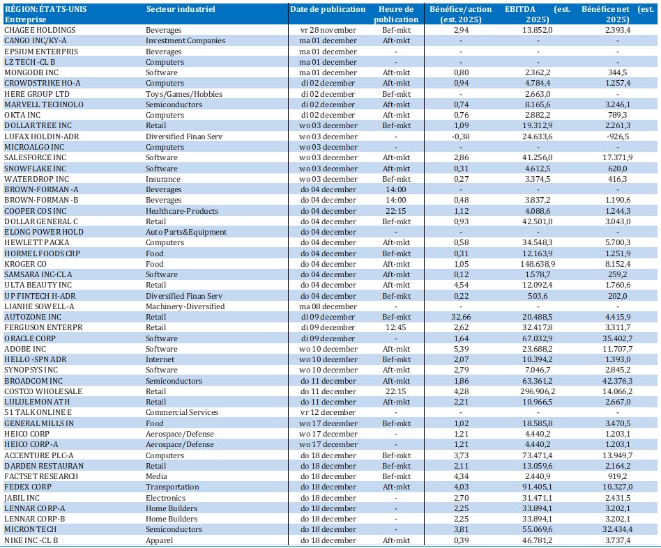 - Ambarella {{71193513, AMBARELLA INC, AMBA}} : au troisième trimestre de son exercice décalé, ce fabricant américain de puces a enregistré un bénéfice Non-GAAP par action de 0,27 dollar, dépassant la moyenne des prévisions des analystes (0,21 dollar) et dépassant nettement le niveau de 0,11 dollar de l'année précédente. Le chiffre d'affaires a progressé à 108,5 millions de dollars (+31,2 %), grâce à une forte croissance dans les domaines de l'IoT et de l'automobile ; il dépasse les prévisions (104,1 millions de dollars). Pour le quatrième trimestre, la société prévoit un chiffre d'affaires compris entre 97 et 103 millions de dollars et un bénéfice par action d'environ 0,07 dollar. Elle continue de miser sur ses puces destinées à l’IA (modèles CV2, CV5 et CV7).