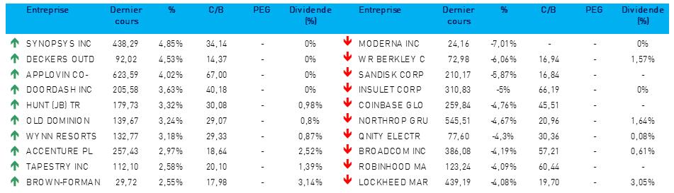 - Nvidia {{277381, NVIDIA CORP., NVDA}} : ce concepteur américain de puces investit 2 milliards de dollars dans Synopsys, un éditeur de logiciels américain spécialisé dans les outils de conception de microprocesseurs, dans le cadre d'un partenariat pluriannuel étendu visant à développer à destination de plusieurs secteurs industriels des outils de conception basés sur l'IA. Avec cette collaboration, il devrait être possible de réduire la durée des simulations à quelques heures (au lieu de plusieurs semaines), grâce à la technologie GPU de Nvidia. Nvidia ouvrirait ainsi de nouvelles possibilités pour les secteurs qui commencent seulement à adopter l'IA. Avec cet accord, Nvidia renforce sa stratégie visant à consolider sa domination sur le marché de l'IA, après d’autres investissements récents, notamment dans OpenAI et dans Anthropic.