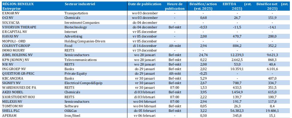 - Biotalys {{343963690, BIOTALYS NV, BTLS}} : cette biotech belge, spécialisée dans la protection biologique des cultures, a obtenu de l'Agence américaine de protection de l'environnement (EPA) l'autorisation de mise sur le marché d’Evoca, son premier biofongicide. Fin octobre 2025, KBCS a déjà relevé son objectif de cours de 6,1 euros à 7,5 euros, lorsque l'EPA a publié un projet de règlement d'enregistrement et adopté une règle définitive excluant les limites de résidus grâce à l'excellent profil de sécurité d'Evoca. KBCS maintient sa recommandation « Acheter ».