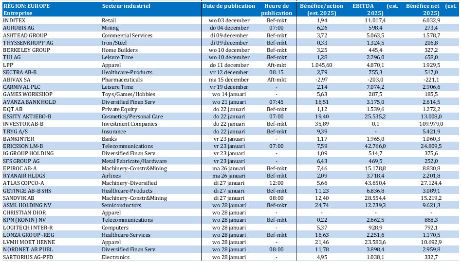 - Ryanair {{17060401, RYANAIR HOLDINGS PLC, RYA}} : en novembre, la compagnie aérienne irlandaise low-cost a transporté 13,8 millions de passagers. Cela représente une augmentation de 6 % par rapport au même mois de l'an dernier. Le taux d'occupation est resté stable à 92 %, identique à celui de novembre 2024. Au cours des 12 derniers mois, le nombre de passagers a augmenté de 5 % à près de 206 millions d’unités, avec un taux d'occupation moyen de 94 %.
